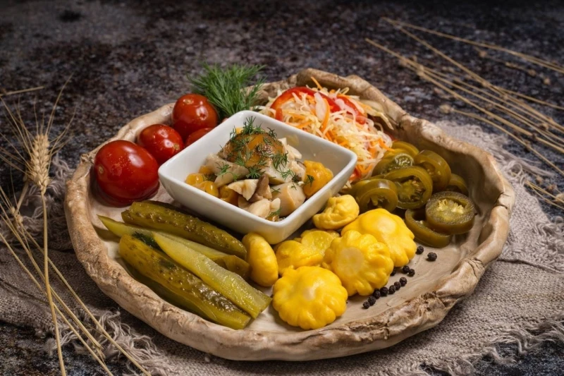Маринованные: огурцы корнишоны, помидоры-черри, капуста квашеная по-домашнему, ассорти грибов, патиссоны, перец халапеньо, зелень.