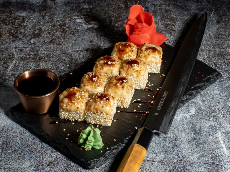 Рис, нори, сыр сливочный, огурец, кунжут, соус айоли, угорь копченый, соус унаги. В блюдо входит соевый соус, маринованный имбирь и васаби. Состав роллов: рис для суши, угорь копченый, сыр творожный (65%), огурцы, кунжут, майонез, водоросли нори, соус унаги. Подается с имбирем (имбирь маринованный розовый ), васаби (вода, порошок горчичный, приправа сухая на основе хрена (хрен сушеный молотый, крахмал кукурузный), антислеживающий агент Е551, антиокислители аскорбиновая кислота и Е224, красители Е102, Е133) и соевым соусом (соевый соус, сахар, апельсин, яблоко). Продукция производится на предприятии, где используются аллергены: морепродукты, молочные продукты, соя, глютен, яйца, кунжут. Срок годности: не более 12 ч при t°+2+6° С или 2 часа при t° +20+40° С